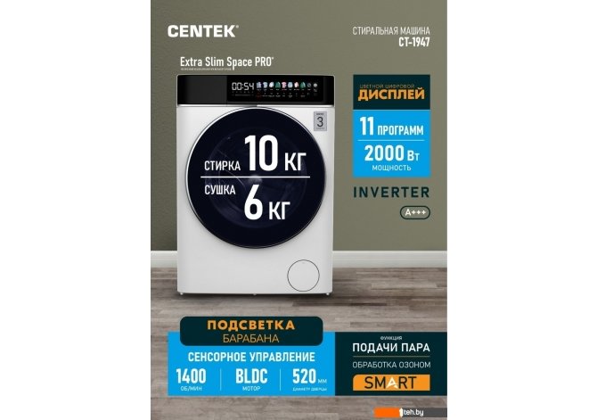 | Информация | CENTEK INVERTER СТ-1947 с сушкой экономит место, время и средства. Благодаря сенсорному управлению и информативному LED-дисплею управлять машиной можно в одно касание. Инверторный двигатель обеспечивает бесшумную работу, высокую энергоэффективность А+++, и мощность 2000 Вт. |