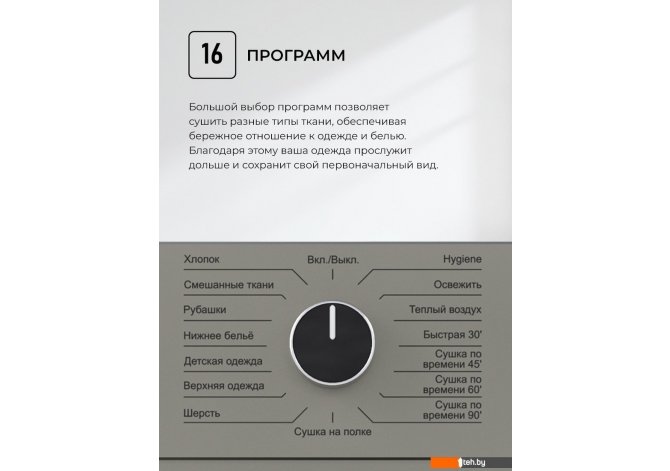 | Все программы | Smart: Автоподбор параметров. Хлопок: Для полотенец и халатов. Смешанные ткани: Хлопок и синтетика. Рубашки: До 5-6 рубашек. Нижнее белье: Для белья. Детская одежда: Для детских вещей. Верхняя одежда: Для пуховиков. Шерсть: Для шерстяных вещей. Сушка на полке: Для обуви. Освежить: Удаление пыли. Быстрая 30?: Для 3 вещей. Сушка по времени: 45?, 60?, 90?. |