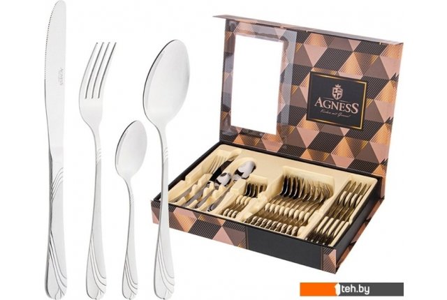 | Информация | Набор столовых приборов AGNESS - это отличный выбор как для ежедневого использования, так и для сервировки праздничного стола. Набор состоиз из 24пр. - 6 столовых ножей, 6 столовых ложек, 6 столовых вилок, 6 чайных ложек и упакован в подарочную упаковку. Все предметы набора выполнены из высококачественной нержавеющей стали. Чтобы столовые приборы прослужили как можно дольше, рекомендована ручная мойка. Не змачивайте столовые приборы в воде. После мытья протрите насухо. Стильный и практичный набор подойдет для каждой кухни! |