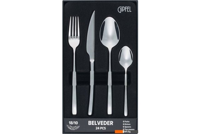 | Информация | Набор столовых приборов Gipfel Belveder 50685. В наборе 24 предмета на 6 персон: 6 столовых ложек (21 см), 6 чайных ложек (14,5 см), 6 вилок (21 см) и 6 столовых ножей (22 см). Комплект выполнен из нержавеющей стали марки 18/10, благодаря чему прослужит вам не один год – материал исключительно долговечный и совершенно не подвержен коррозии. Кроме того, данная марка стали абсолютно экологична, легко моется и максимально неприхотлива в уходе. Приборы выполнены в классическом стиле, а яркая зеркальная полировка добавляет внешнему виду дополнительную изысканность. На корпус нанесен логотип Gipfel. Подходят для ежедневной и праздничной сервировки. Приборы удобно располагаются в руке. Столовые приборы рекомендуется мыть без абразивных средств, желательно в ручном режиме, так они дольше сохранят свой блеск. Набор в подарочной черной коробке с нанесенными серебристым цветом логотипом и характеристиками товара методом тиснения. Внутри коробки приборы располагаются на черном вельветовом ложементе с надежной фиксацией. Набор столовых приборов Gipfel Belveder станет роскошным подарком. |