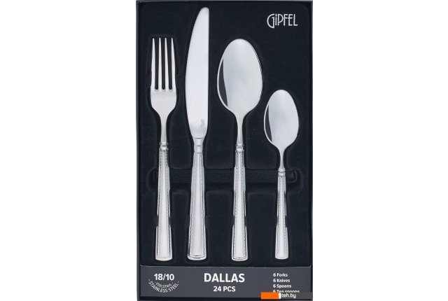 | Информация | - Набор столовых приборов Gipfel Dallas 52523 включает 24 предмета, среди которых: 6 столовых ножей (24 см), 6 столовых вилок (21 см), 6 столовых ложек (21 см) и 6 чайных ложек (16 см). - Этот набор сочетает в себе изящество и элегантность. Изготовленный из нержавеющей стали 18/10, он безопасен для здоровья и отличается прочностью и долговечностью. - Блестящая поверхность и рукоятка с рельефным узором прекрасно дополнят как повседневную, так и праздничную сервировку, создавая атмосферу торжественного обеда или ужина. Приборы удобно лежат в руке. - Рекомендуется мыть столовые приборы без абразивных средств, предпочтительно вручную, чтобы они дольше сохраняли свой блеск. - Набор упакован в стильную черную подарочную коробку с тисненым серебристым логотипом и характеристиками товара. Внутри приборы надежно фиксируются на черном вельветовом ложементе. - Набор столовых приборов Gipfel Dallas станет великолепным подарком для любого случая. |