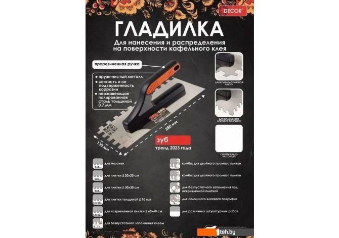 | Информация | Гладилка двойной зуб 6?6 мм + 12?12 мм, серии Profi, 3K для нанесения и распределения клея для плитки, кафеля и керамогранита.Удобная прорезиненная трехкомпонентная ручка облегчает работу с раствором._x000D_ Полотно из нержавеющей полированной стали._x000D_ Форма — зубчатая._x000D_ Для работы с текучим клеевым составом. |