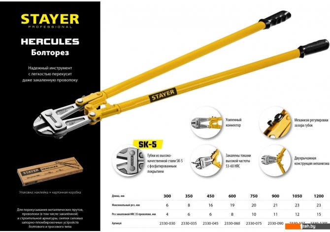 | Информация | Профессиональный болторез для перекусывания болтов, металлических прутов и стальной проволоки, в том числе закаленной. |