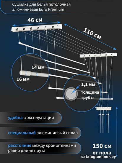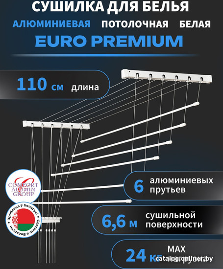 Фотографии, описание и технические характеристики модели сушилки для белья Comfort Alumin Euro Premium потолочная 6 прутьев 110 см (алюминий/белый) взяты из открытых источников, официального сайта производителя или представительства Comfort Alumin в Республике Беларусь.