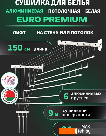 Фотографии, описание и технические характеристики модели сушилки для белья Comfort Alumin Euro Premium потолочная 6 прутьев 150 см Лифт (алюминий/белый) взяты из открытых источников, официального сайта производителя или представительства Comfort Alumin в Республике Беларусь.