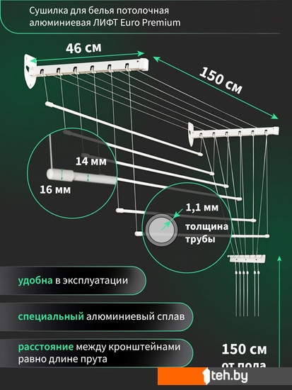 Если хотите купить сушилка для белья Comfort Alumin Euro Premium потолочная 6 прутьев 150 см Лифт (алюминий/белый) то следует уточнить все параметры и габариты модели перед покупкой. Представленые характеристики на сайте 1teh.by могут отличаться от действительных или указанных производителем. Описание, фото товара и технические характеристики представлены для справки.