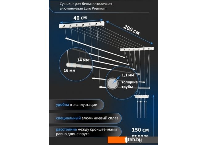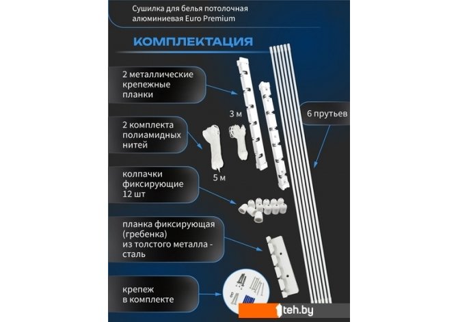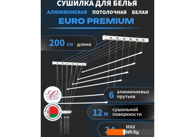 Фотографии, описание и технические характеристики модели сушилки для белья Comfort Alumin Euro Premium потолочная 6 прутьев 200 см (алюминий/белый) взяты из открытых источников, официального сайта производителя или представительства Comfort Alumin в Республике Беларусь.