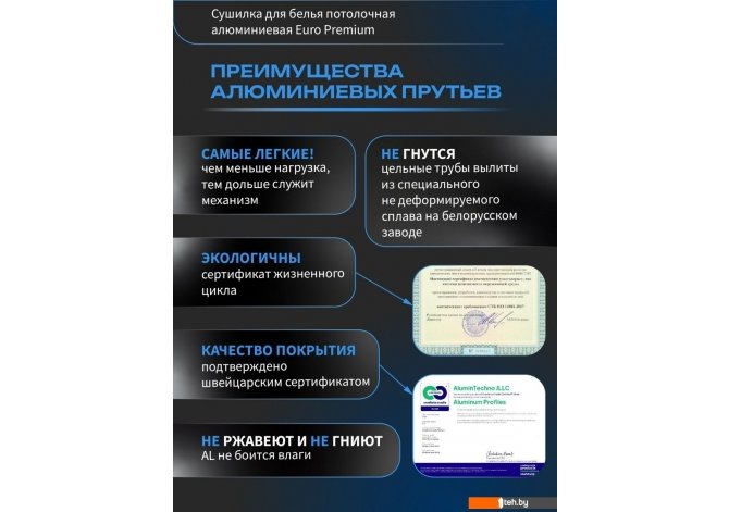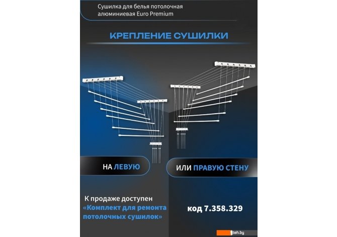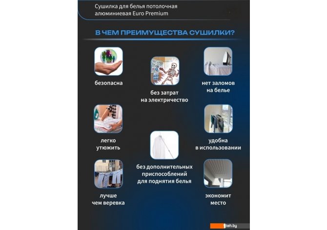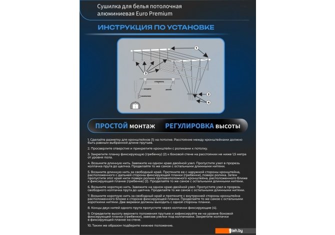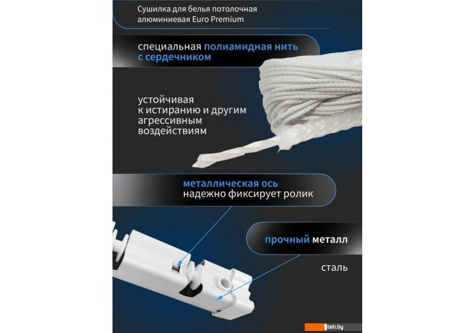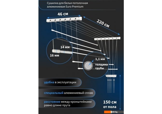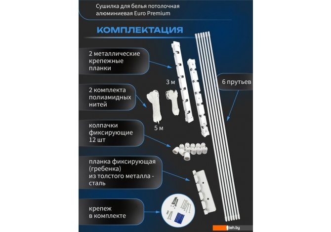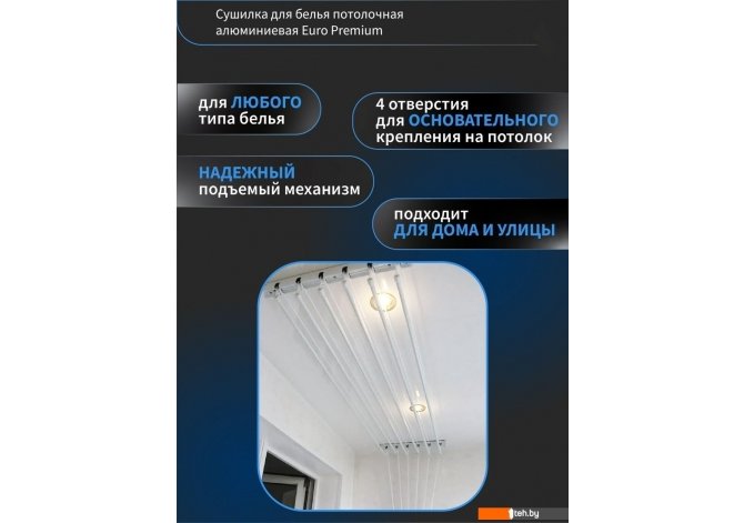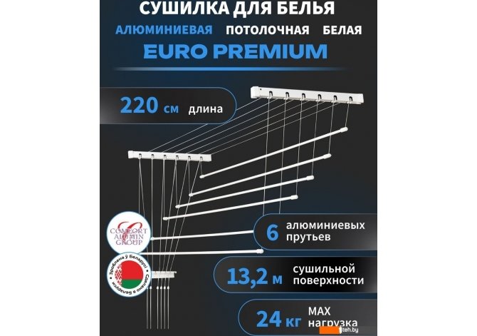 Фотографии, описание и технические характеристики модели сушилки для белья Comfort Alumin Euro Premium потолочная 6 прутьев 220 см (алюминий/белый) взяты из открытых источников, официального сайта производителя или представительства Comfort Alumin в Республике Беларусь.