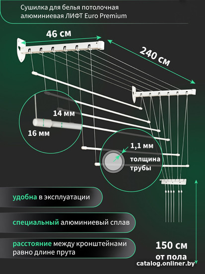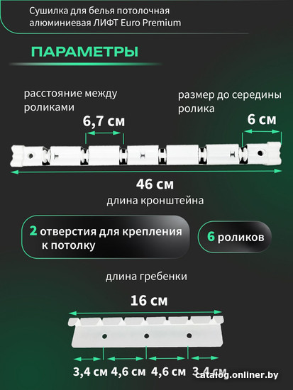 Если хотите купить сушилка для белья Comfort Alumin Euro Premium потолочная 6 прутьев 240 см Лифт (алюминий/белый) то следует уточнить все параметры и габариты модели перед покупкой. Представленые характеристики на сайте 1teh.by могут отличаться от действительных или указанных производителем. Описание, фото товара и технические характеристики представлены для справки.