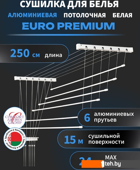Фотографии, описание и технические характеристики модели сушилки для белья Comfort Alumin Euro Premium потолочная 6 прутьев 250 см (алюминий/белый) взяты из открытых источников, официального сайта производителя или представительства Comfort Alumin в Республике Беларусь.