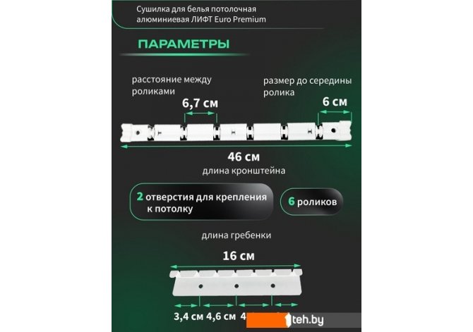 Если хотите купить сушилка для белья Comfort Alumin Euro Premium потолочная 6 прутьев 250 см Лифт (алюминий/белый) то следует уточнить все параметры и габариты модели перед покупкой. Представленые характеристики на сайте 1teh.by могут отличаться от действительных или указанных производителем. Описание, фото товара и технические характеристики представлены для справки.