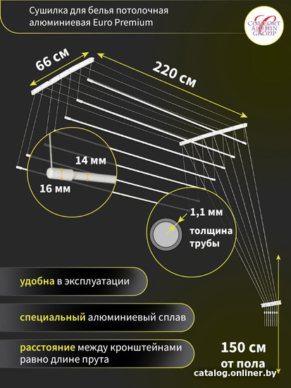 Фотографии, описание и технические характеристики модели сушилки для белья Comfort Alumin Euro Premium потолочная 7 прутьев 220 см (алюминий/белый) взяты из открытых источников, официального сайта производителя или представительства Comfort Alumin в Республике Беларусь.