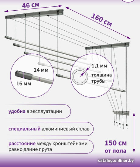 Если хотите купить сушилка для белья Comfort Alumin Group Потолочная 5 прутьев Silver Star 160 см (алюминий) то следует уточнить все параметры и габариты модели перед покупкой. Представленые характеристики на сайте 1teh.by могут отличаться от действительных или указанных производителем. Описание, фото товара и технические характеристики представлены для справки.