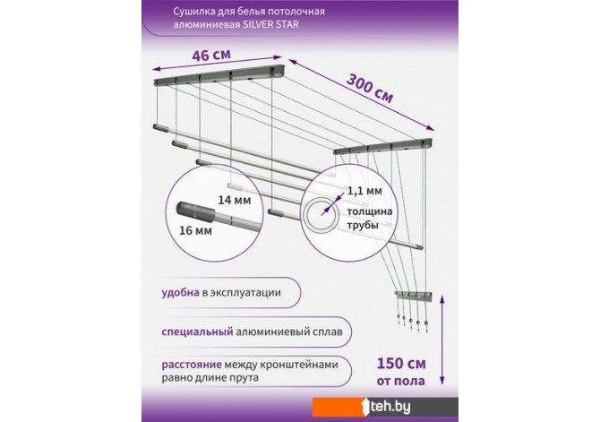 Если хотите купить сушилка для белья Comfort Alumin Group Потолочная 5 прутьев Silver Star 300 см (алюминий) то следует уточнить все параметры и габариты модели перед покупкой. Представленые характеристики на сайте 1teh.by могут отличаться от действительных или указанных производителем. Описание, фото товара и технические характеристики представлены для справки.