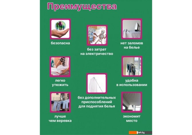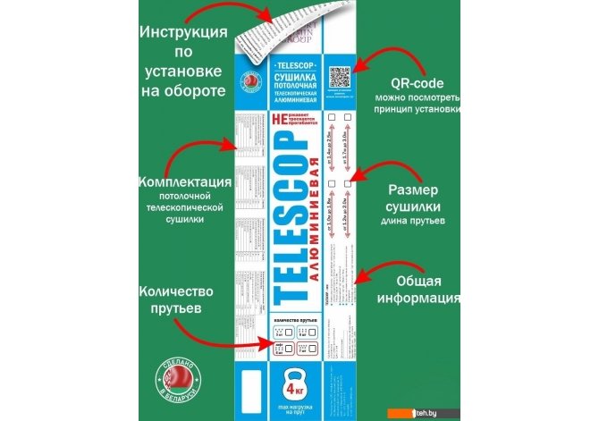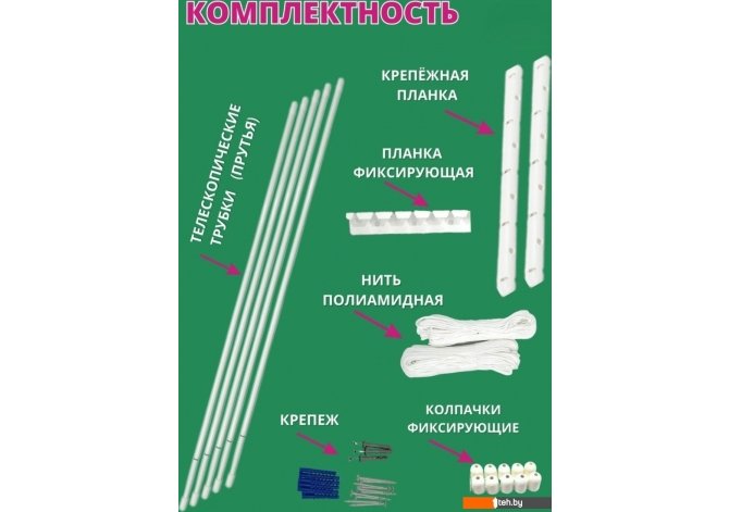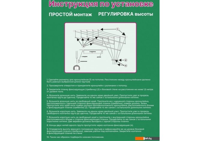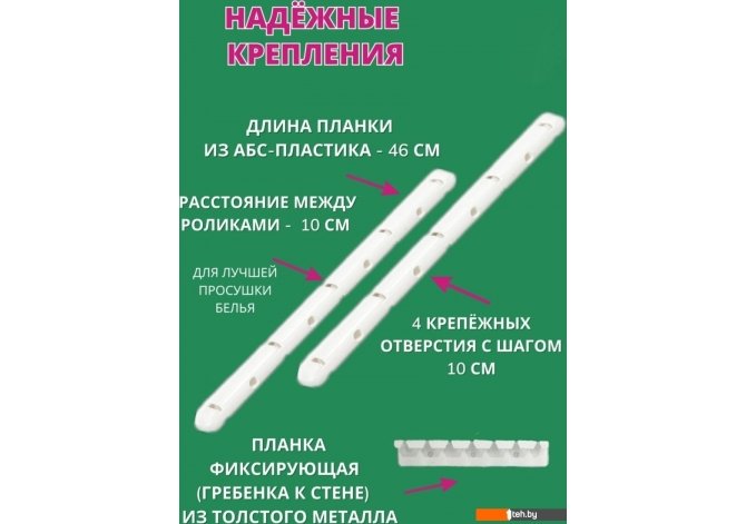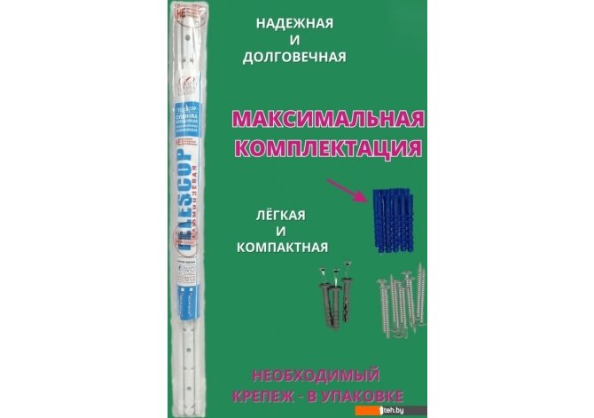 Информация | ? Сушилка для белья Comfort Alumin Group - потолочная телескопическая модель с усиленной и регулируемой по длине сушильной поверхностью. Изготовлена из экологичных и износостойких материалов. Ресурс в 2-3 раза выше, чем у обычной сушилки. ? Регулируемая длина сушилки. Каждый сушильный стержень состоит из двух алюминиевых трубок разного диаметра. Зазор между трубками минимальный и закрывается специальной пластиковой втулкой. Сушилка может быть раздвинута и сдвинута на нужную длину от 120 до 200 см. ? Одна телескопическая система заменяет 12 размеров стандартной потолочной сушилки. Не нужно точно знать нужную длину, чтобы подобрать сушилку. ? Сушилка имеет полезную площадь из 5 прутьев, что позволяет одновременно сушить большое количество белья. Максимальная нагрузка на один сушильный стержень - 4 кг мокрого белья, на всю сушилку - до 20 кг. ? Уникальный алюминиевый сплав не позволяет прутьям прогибаться и трескаться. Сушилка сохраняет свою прочность и эстетику на протяжении долгих лет использования. ? Алюминиевый прут в 2,5 раза легче стального, что снижает давление на нить и фурнитуру и уменьшает их износ. ? Сушилка из алюминия не подвержена коррозии. Дополнительная защита - полимерное покрытие, качество которого подтверждено сертификатом. ? Крепежные детали изготовлены из износостойких материалов. Нить с сердечником устойчива к растяжению, истиранию, влаге и плесени. ? В комплектацию входят метизные изделия нужного размера. Нет необходимости самостоятельно подбирать крепеж. ? На этикетке есть подробная инструкция по установке сушилки и QR-код для доступа к видеоинструкции. ?? Прутья нельзя раздвигать более, чем на указанный размер сушилки. Запас длины внутренней трубки предусмотрен, чтобы при нагрузке трубки не разъединились. ? В комплекте по 5 нитей длиной 5 и 3 метра. Нити необходимо завязать двойными узелками и вщелкнуть в прорези на краях прутьев. ? Фиксатор нити может крепиться как на правую, так и на левую стену. Крепежные отверстия находятся на расстоянии друг от друга и от края. ? Размеры потолочных крепежных планок: 46?3?2,5 см. В каждой планке 5 направляющих нить роликов и 4 отверстия для крепления к потолку. |