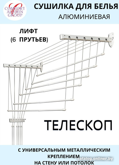 Фотографии, описание и технические характеристики модели сушилки для белья Comfort Alumin Group Универсальное крепление телескопическая Лифт 6 прутьев 120-200см (алюминий/белый) взяты из открытых источников, официального сайта производителя или представительства Comfort Alumin в Республике Беларусь.