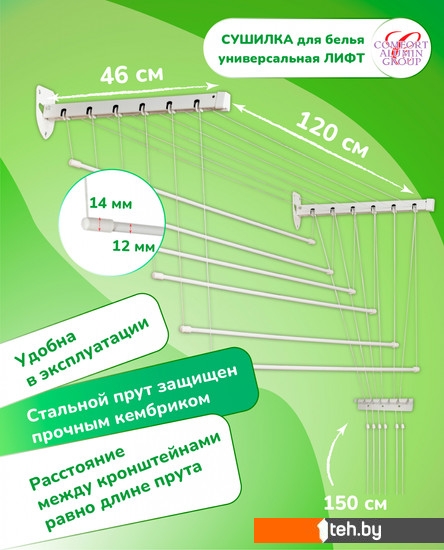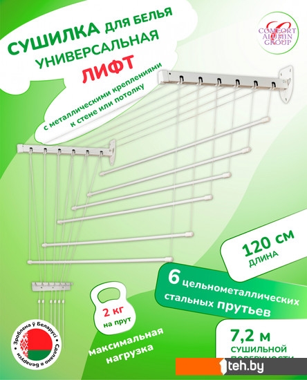 Фотографии, описание и технические характеристики модели сушилки для белья Comfort Alumin Лифт универсальное крепление 6x120см (сталь/белый) взяты из открытых источников, официального сайта производителя или представительства Comfort Alumin в Республике Беларусь.