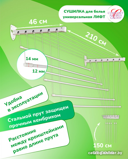 Фотографии, описание и технические характеристики модели сушилки для белья Comfort Alumin Лифт универсальное крепление 6x210см (сталь/белый) взяты из открытых источников, официального сайта производителя или представительства Comfort Alumin в Республике Беларусь.