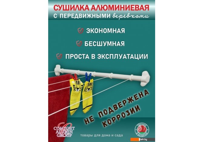 Фотографии, описание и технические характеристики модели сушилки для белья Comfort Alumin Lux Настенная 5 нитей 0.5м (алюминий/белый) взяты из открытых источников, официального сайта производителя или представительства Comfort Alumin в Республике Беларусь.