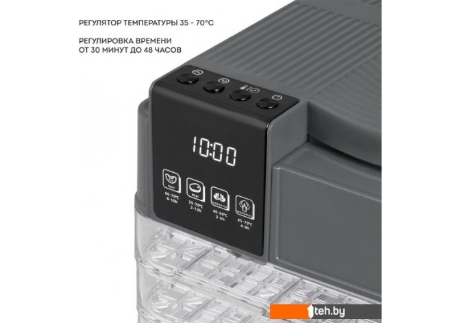 | Комплектация | - Электросушилка - Прозрачный съёмный поддон: 5 шт. - Книга рецептов - Руководство по эксплуатации |