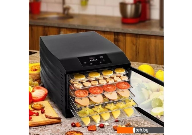 | Информация | С электросушилкой Kitfort KT-1920 у вас под рукой будет всегда живая еда. Прибор насушит на всю зиму помидоры, кабачки, баклажаны, клубнику, абрикосы, персики, тыкву, грибы, зелень, мясо, рыбу, хлеб и многое другое. Сушилка оборудована большим мощным вентилятором, что обеспечивает равномерный горизонтальный обдув всех 6 поддонов. Поток воздуха направлен горизонтально, поэтому запахи продуктов с разных поддонов не смешиваются. |