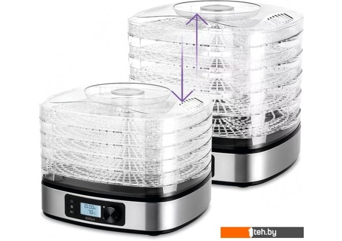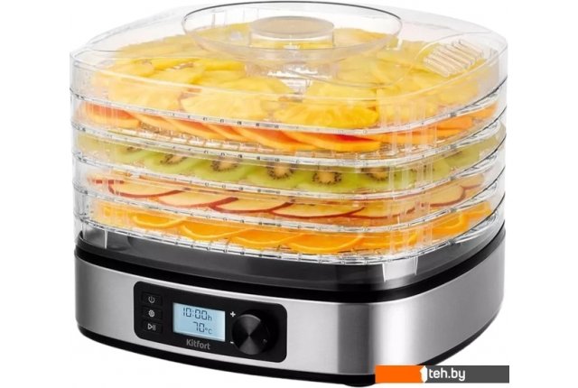 | Информация | Сушилка для овощей и фруктов КТ-1943 сохранит любимые фрукты и овощи полезными круглый год! Прибор насушит на всю зиму помидоры, кабачки, баклажаны, клубнику, абрикосы, персики, тыкву, грибы, зелень, а также хлеб. На панели управления: дисплей, отображающий температуру и время, кнопки и регулятор. При помощи регулятора можно установить температуру в диапазоне от 35 до 75 °C с шагом 5 градусов и время в диапазоне от 30 минут до 36 часов работы с шагом 30 минут. Сушилка Kitfort KT-1943 имеет в комплекте 5 поддонов из прозрачного пластика, вы можете регулировать их по высоте благодаря специальным выступам. Пластик BRA-free не содержит Бисфенол А, а значит – полностью безопасный для здоровья. В сушилке установлен мощный нагревательный элемент и вентилятор, обеспечивающий равномерное распределение нагретого воздуха по всей камере, так продукты просушатся идеально! Поддоны можно установить в двух положениях: компактно и с удвоенной высотой. Сушилка для овощей и фруктов КТ-1943 имеет компактные размеры, а благодаря стильному дизайну впишется в любой кухонный интерьер! Храните любимые фрукты и овощи полезными круглый год. Длина шнура: 1.2 м. |