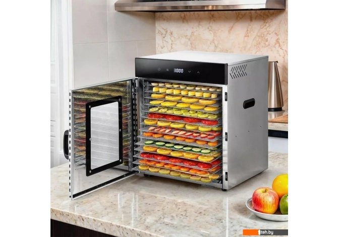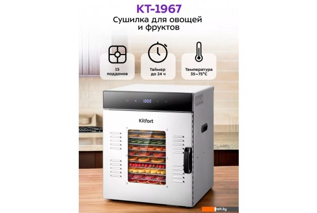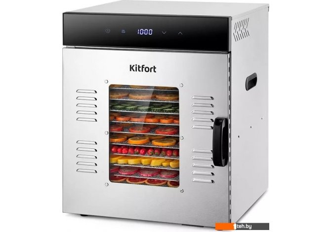 | Информация | - Вместительная сушилка Kitfort КТ-1967 сохранит любимые фрукты и овощи полезными круглый год! Она насушит на всю зиму мясо, рыбу, помидоры, клубнику, персики, грибы, зелень, хлеб, а с помощью сплошных поддонов сушилка останется чистой. - Дисплей показывает температуру и время сушки. На сушилке можно установить температуру сушки в диапазоне 35-75°С с шагом 5 градусов. Сушилка оснащена таймером до 24 часов работы с шагом 30 минут. - В комплекте к сушилке КТ-1967 идут 14 металлических поддонов и 1 поддон для жидкости. Металлические поддоны подходят для большинства продуктов. Поддон для жидкости кладут на дно сушилки, чтобы сок падал на него. - В сушилке установлен мощный нагревательный элемент и вентилятор с лопастями большого диаметра, обеспечивающий равномерное распределение нагретого воздуха. Горизонтальному обдуву смешение запахов при сушке разных продуктов минимально. - В сушилке КТ-1967 для того, чтобы было удобно наблюдать за процессом сушки, предусмотрена прозрачная дверца. Это также позволяет лишний раз её не открывать во время работы прибора. - Прибор имеет строгие формы и минималистичный, стильный дизайн. Корпус сушилки выполнен из металла, а дверца - из сочетания стекла и металла. Сушилка оснащена защитой от перегрева. |