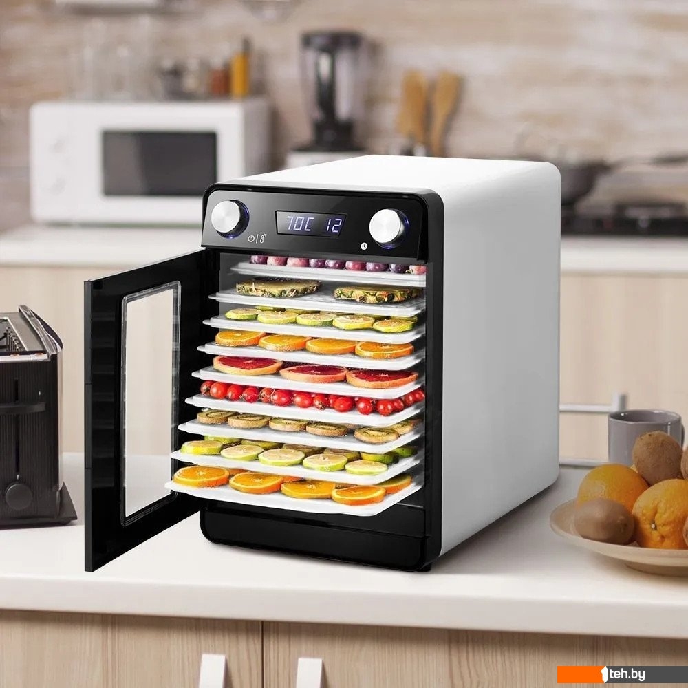 Информация | Вместительная сушилка для овощей и фруктов КТ-1981 сохранит любимые фрукты и овощи полезными круглый год! Прибор насушит на всю зиму помидоры, кабачки, баклажаны, клубнику, абрикосы, мясо, рыбу, персики, тыкву, грибы, зелень, а также хлеб. При помощи регуляторов на панели управления вы можете установить температуру в диапазоне от 40 до 70°С с шагом 5°С и таймер в диапазоне от 1 часа до 48 часов с шагом 1 час. На дисплее отображается установленный таймер и температура. Сушилка имеет в комплекте 8 металлических поддонов, 8 сеток для мелких продуктов и 8 пластиковых сплошных поддонов. Вы можете класть один поддон на низ сушилки, чтобы сок и остатки от продуктов падали на него. Устройство обладает высокой мощностью в 550 Вт. Устройство отлично подойдёт для приготовления нескольких продуктов одновременно. |