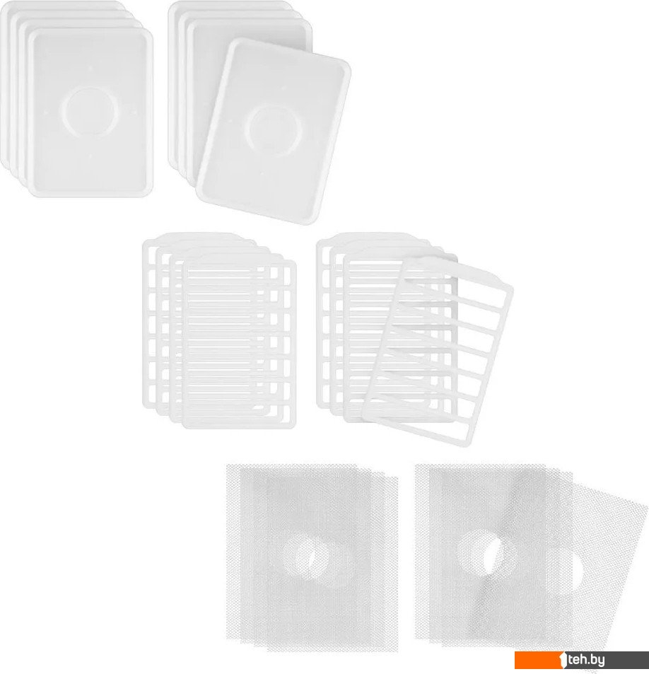 Комплектация | 8 металлических поддонов, 8 сеток для мелких продуктов и 8 пластиковых сплошных поддонов |