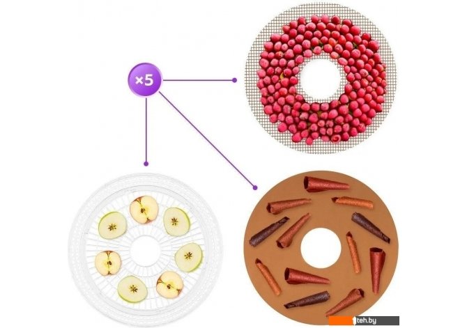 | Комплектация | 5 поддонов из пластика, 5 сеток для более мелких продуктов и 5 поддонов для пастилы |