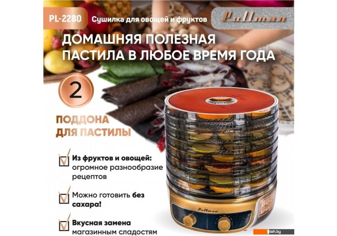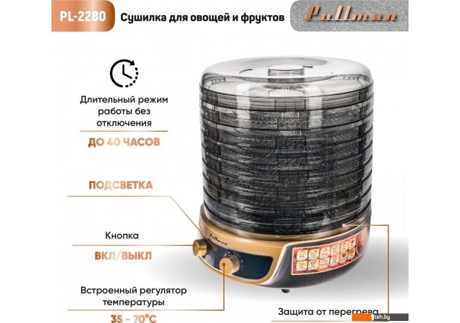 Если хотите купить сушилка для овощей Pullman PL-2280 то следует уточнить все параметры и габариты модели перед покупкой. Представленые характеристики на сайте 1teh.by могут отличаться от действительных или указанных производителем. Описание, фото товара и технические характеристики представлены для справки.