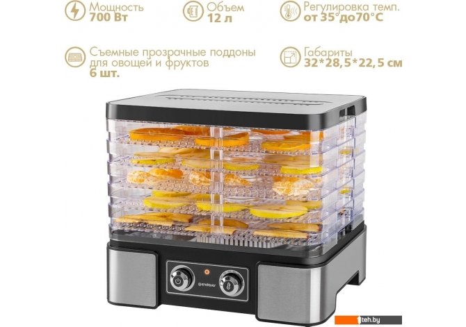 | Информация | - Представляем вам сушилку для овощей и фруктов Endever Skyline FD-61 с мощностью 700 Вт и регулировкой температуры от 35 до 70 градусов. В комплекте идет 6 съемных прозрачных поддонов, с помощью которых вы сможете контролировать процесс сушки. Также положение поддонов имеет 2 уровня: с маленьким зазором – для тонких овощей и фруктов и с большим зазором – для более толстых. Общий объем с большим расстоянием между поддонами составляет 12 л, а с маленьким – 7 л. Прозрачные стенки позволяют следить за процессом без необходимости открывать устройство. - Система сушки с циркуляцией горячего воздуха обеспечит быстрое и равномерное высушивание продуктов. Удобное механическое управление позволит легко настроить параметры сушки. Регулируйте высоту поддонов для оптимального распределения продуктов и получения наилучшего результата. - Автоматический вентилятор обеспечивает оптимальное воздушное циркулирование. Сушилка для овощей и фруктов Endever Skyline FD-61 – идеальное решение для здорового и вкусного лакомства, которое вы сможете приготовить в удобное для вас время. - Не упустите возможность сделать ваши закуски более полезными и вкусными! |