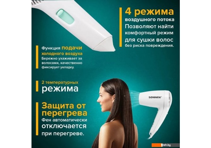 | Информация | - Сушилка для волос Sonnen HD-1288D предназначена для сушки волос потоком теплого воздуха. Идеально подходит для установки в гостиницах, бассейнах, фитнес-клубах, в раздевалках складских и производственных комплексов. Так же может использоваться в личных ванных комнатах. - Характеристики: - Мощность: 1200 Вт - Регулировка воздушного потока (кол-во скоростей): 4 - Регулировка температуры (кол-во режимов): 2 - Серия: HD-128 - Количество насадок: 1 шт. - Функция ''холодный воздух'' - Отключение при перегреве - Длина сетевого шнура: 0.9 м - Материал корпуса: пластик - Цвет корпуса: белый - Вес: 700 г - Обратите внимание на высокое качество и надежность данной сушилки! |
