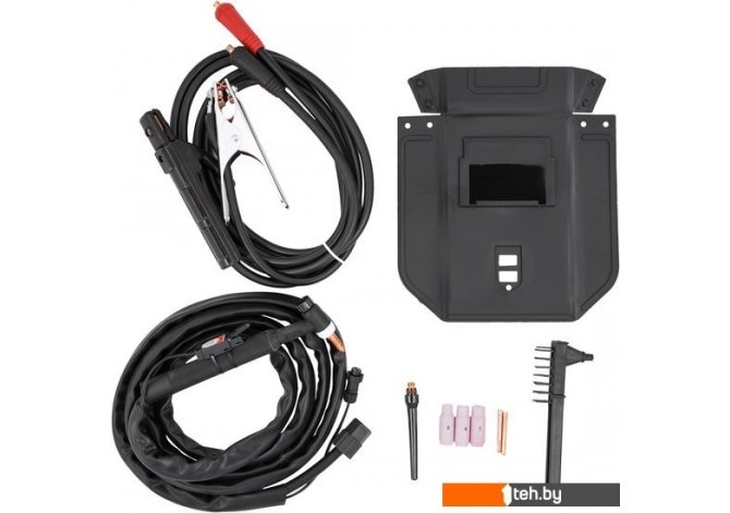 | Комплект поставки | Cварочный щиток, молоток-щетка, TIG горелка 3,1 м., держатель электрода ММА 2 м., кабель заземления 1,6 м., кабель питания 1,75 м., 3 сменных керамических сопла (№4,5,6) и 2 наконечника для сопла TIG горелки, защитный колпачок для вольфрамового электрода. |