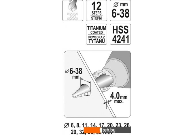 | Рабочий диаметр | 6 мм, 8 мм, 11 мм, 14 мм, 17 мм, 20 мм, 23 мм, 26 мм, 29 мм, 32 мм, 35 мм, 38 мм |