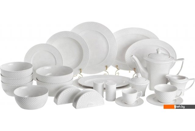 | Состав набора | блюдо (4 шт.), блюдце (24 шт.), перечница (1 шт.), салатник (14 шт.), салфетница (2 шт.), сахарница (1 шт.), солонка (1 шт.), тарелка закусочная (десертная) (12 шт.), тарелка столовая глубокая (12 шт.), чайник (1 шт.), чашка (24 шт.), тарелка столовая обеденная (12 шт.), молочник (1 шт.) |