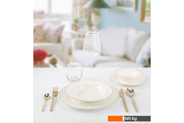 | Информация | Набор столовой посуды Arya модель Dory Gold из коллекции Exclusive, состоящий из 24 предметов. Посуда изготовлена из костяного фарфора. Основной цвет белый с золотистой окантовкой. |