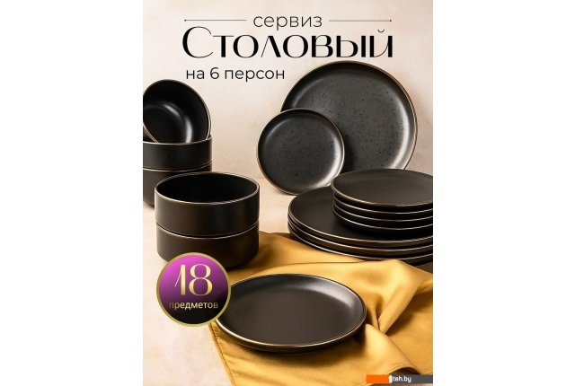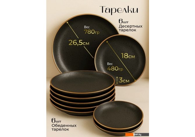 | Информация | Набор столовой посуды на шесть персон включает 18 предметов: шесть обеденных тарелок диаметром 26.5 см, шесть закусочных тарелок диаметром 18 см и шесть салатников диаметром 15 см. Изделия из керамики отличаются прочностью и экологической безопасностью. Элегантный черный цвет с золотистой обводкой подходит для сервировки праздничного и повседневного стола. Круглая форма классического дизайна сочетается с любым стилем интерьера. Посуда подходит для использования в микроволновой печи и мытья в посудомоечной машине, что упрощает уход. Высота салатников составляет 6.5 см, тарелок — 3 см. Использование набора столовой посуды создает целостную эстетику сервировки, сохраняя тепло блюд и предлагая практичность ежедневной эксплуатации. Читать дальше |