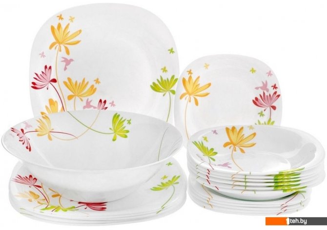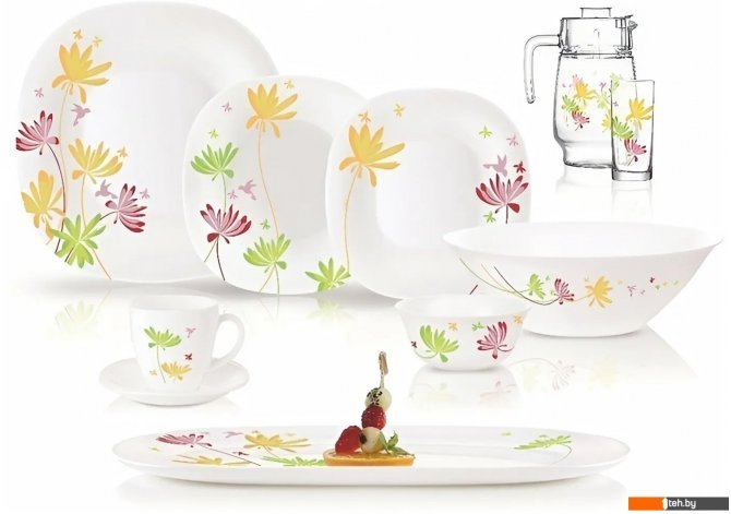 | Состав набора | блюдо (1 шт.), блюдце (6 шт.), графин (1 шт.), крышка (1 шт.), салатник (7 шт.), стакан (6 шт.), тарелка закусочная (десертная) (6 шт.), тарелка столовая глубокая (6 шт.), чашка (6 шт.), тарелка столовая обеденная (6 шт.) |