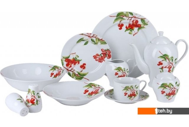 | Состав набора посуды | обеденная тарелка, суповая тарелка, десертная тарелка, салатник большой, чайная чашка, чайник заварочный, блюдце, сахарница, сливочник |