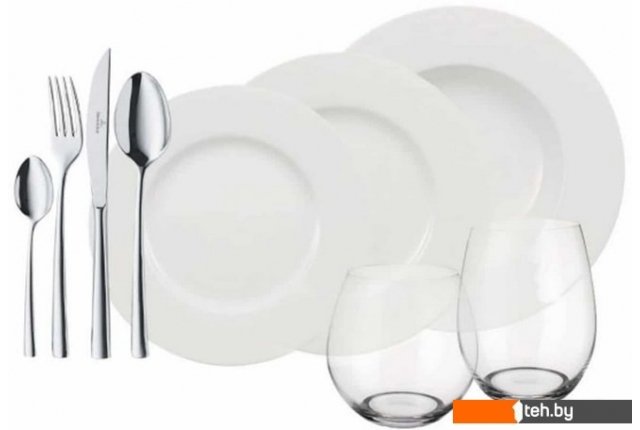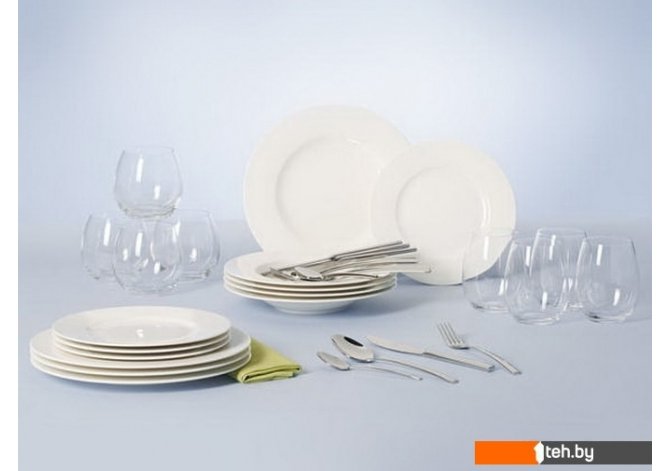 | Состав набора посуды | обеденная тарелка, суповая тарелка, десертная тарелка, стакан, ложка, чайная ложка, вилка, нож |