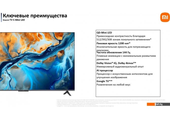 | Информация | Окунитесь в мир насыщенных цветов и впечатляющего качества изображения с Xiaomi TV S Mini LED! Этот телевизор оснащен передовым 4K QD-MiniLED экраном, который обеспечивает потрясающую яркость и глубину оттенков. Частота обновления 144 Гц гарантирует невероятную плавность и динамичность каждой сцены. Элегантный дизайн с тонкой металлической рамкой гармонично впишется в любой интерьер, а интеллектуальные AI-алгоритмы оптимизируют картинку для безупречного визуального опыта. |
