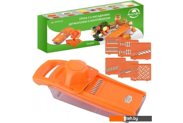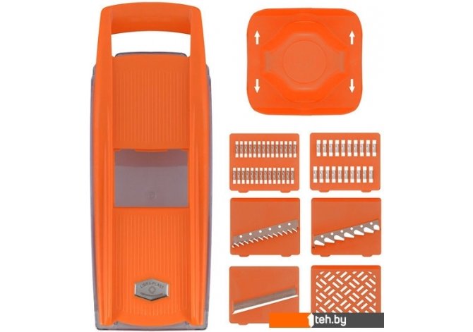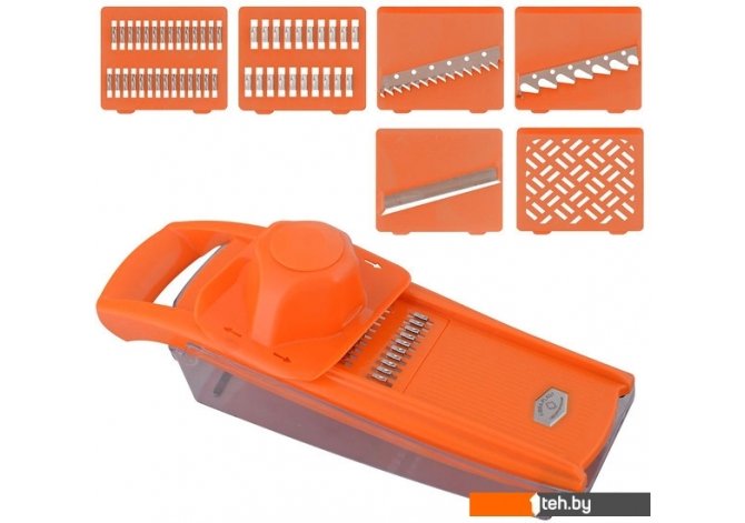 | Информация | Используется для измельчения овощей и фруктов. В комплект входит: 1. Корпус терки с отверстием, куда вставляются насадки. 2. Держатель-толкатель, который посредством 4-х металлических стержней удерживает овощи под пластиковым колпаком – предохранителем, не допуская непосредственного контакта рук с режущими элементами терки. 3. Пластиковый контейнер для нарезанных овощей и фруктов. Также может использоваться для хранения насадок и держателей внутри. 4. Шесть насадок: 5 из пластмассы с металлическими ножами-вставками, 1 насадка из пластмассы (для фруктовых пюре и овощных смесей). Насадки предназначены: 1) для нарезания тонких ломтиков из овощей, фруктов и шинковки капусты, 2) для нарезки крупных и мелких брусочков из картофеля (картофель-фри), 3) для корейских салатов, нарезки моркови, свеклы, редьки, огурцов, 4) для приготовления нежных овощных смесей и сочных фруктовых пюре. Изготовлено: лезвия из коррозионностойкой (нержавеющей) стали, корпус тёрки из пластмассы (АБС), контейнер из пластмассы (полистирол). |