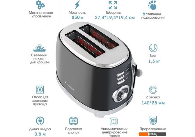 | Информация | - Тостер TUAREX TK-6007 – это идеальное сочетание стиля и функциональности для вашего завтрака! С мощностью 850 Вт и двумя отсеками шириной 38 мм, он быстро и равномерно поджарит хлеб, обеспечивая вам идеальные тосты. - Удобное механическое управление и LED-индикация кнопок делают процесс использования простым и интуитивно понятным. Функции быстрого извлечения тостов, разморозки, подогрева и отмены дают вам полный контроль над приготовлением. Автоцентрирование тостов гарантирует, что каждый кусочек будет поджарен равномерно. - Вы можете выбрать одну из шести степеней поджаривания, чтобы достичь желаемого уровня хрустящей корочки. Лоток для крошек и отсек для провода питания обеспечивают удобство в использовании и хранении. Длина провода в 0,8 метра позволяет легко разместить тостер на вашей кухне. - TUAREX TK-6007 – это надежный помощник для создания идеального завтрака. Наслаждайтесь каждым кусочком поджаренного хлеба с этим стильным и точным устройством! |