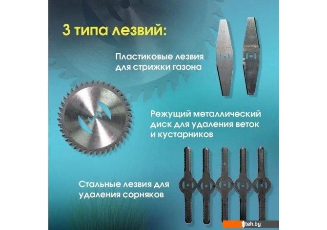 | Комплектация | - аккумулятор (2 шт.), - зарядное устройство, - металлический нож, - пластиковый нож, - металлический диск, - набор крепежный, - защитный кожух. |