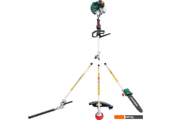 | Комплектация | - удлинитель, - защитный кожух, - диск/нож, - триммерная головка, - кусторез (насадка), - пила (насадка), - набор инструментов (ключей), - емкость для топливной смеси, - руководство по эксплуатации |