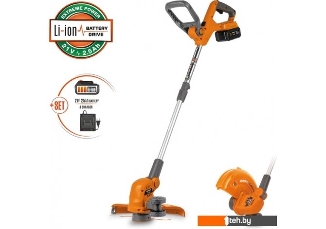 | Комплектация | - Триммер 1 шт - Катушка с леской 1 шт - Аккумулятор 1 шт - Зарядное устройство 1 шт - Защитный кожух 1 шт - Крепежные элементы 1 компл. - Транспортировочные колеса 1 шт - Руководство по эксплуатации 1 шт |