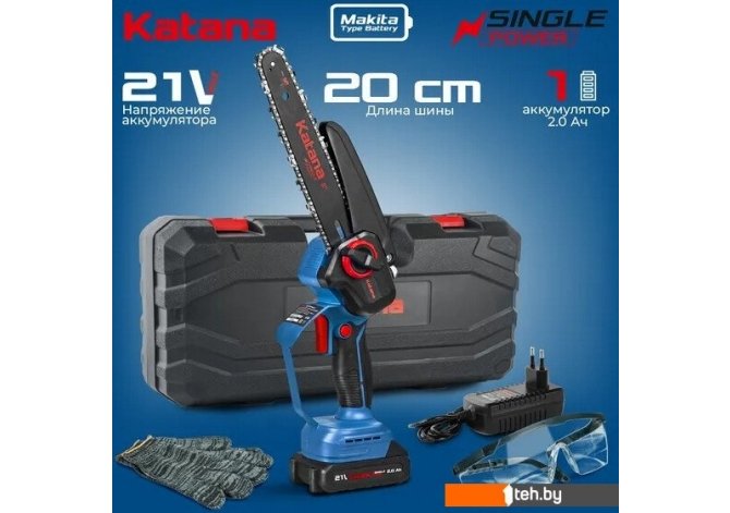 | Комплект поставки | 1. Пила цепная аккумуляторная KATANA – 1 шт. 2. Пильная шина – 1 шт. 3. Цепь пильная – 1 шт. (для моделей AP3208, AP3208-1, AP3210PRO, AP3210PRO-1 – 2 шт.) 4. Инструкция по эксплуатации с гарантийным талоном – 1 шт. 5. Пластиковый кейс – 1 шт. 6. Зарядное устройство – 1 шт. 7. Аккумуляторная батарея. |