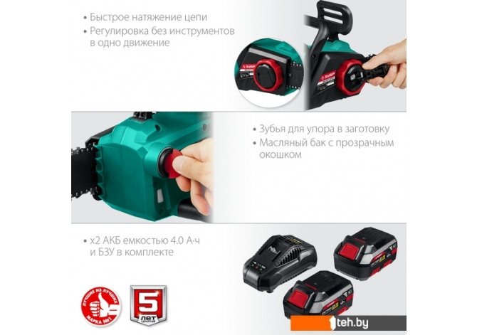 | Комплект поставки | - Пила; - Аккумулятор - 2шт; - Зарядное устройство; - Шина; - Цепь пильная; - Кожух шины; - Руководство по эксплуатации. |