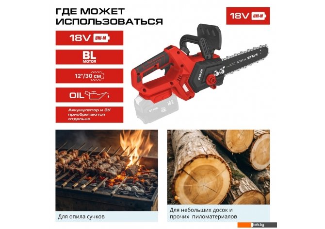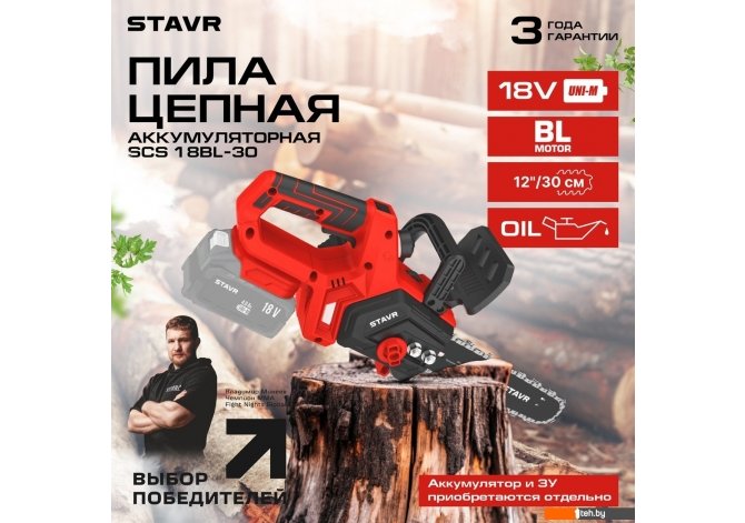 | Информация | - Цепная аккумуляторная пила STAVR SCS 18BL-30 — это мощный и надёжный инструмент, созданный для эффективной работы в саду и на строительной площадке. Пила работает на единой аккумуляторной платформе 18V UNI-M, что обеспечивает стабильную производительность и совместимость с различными инструментами. - Благодаря бесщеточному двигателю (BL) с высоким КПД, пила STAVR SCS 18BL-30 демонстрирует высокую мощность и экономичный расход заряда. Длина шины составляет 30 см, скорость движения цепи — 10 м/с, что позволяет справляться с разными задачами быстро и эффективно. Шаг зубьев 3/8" и толщина 1,3 мм обеспечивают качественное и точное распиливание. - Пила STAVR оснащена автоматической смазкой цепи и натяжителем цепи, что упрощает обслуживание и продлевает срок службы инструмента. Легкий вес в 2,5 кг делает пилу удобной в эксплуатации, снижает усталость при длительной работе. - Комплектация включает шину, цепь и набор инструментов, что обеспечивает готовность к работе сразу после покупки. Пила STAVR SCS 18BL-30 — это оптимальное сочетание мощности, удобства и безопасности для вашего дома и сада. - Не упустите возможность сделать свою работу более эффективной! |